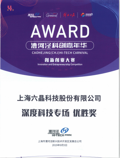 上海市六晶科技股份有限公司于2019年9月5日參加漕河涇科創(chuàng)嘉年華創(chuàng)新創(chuàng)業(yè)大賽,榮獲深度科技專場“優(yōu)勝獎” 。